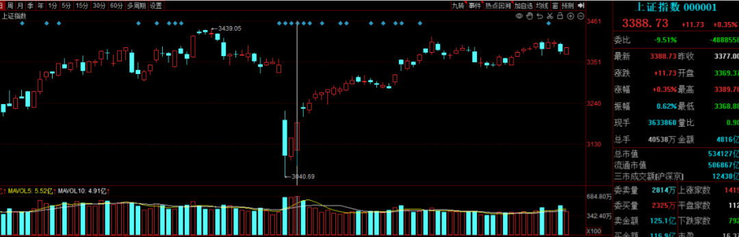 周一,A股三大指数集体收涨,截至收盘,沪指涨0.35%,收报3388.73点;深证成指涨0.41%,收报10163.55点;创业板指涨0.66%,收报2057.32点。沪深两市成交额达到12151亿,较上周五缩量2522亿。